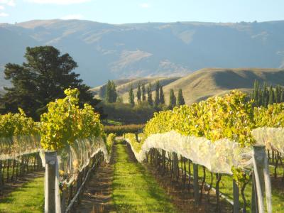 Wir passieren auf dem Weg viele Apfelfelder (da kommen die neuseeländischen Braeburn aus dem Supermarkt her) und Weingüter. Wie befinden uns in mitten von Otago, der Heimat richtig guten Pinot Noirs. Wir passieren Weingüter, die sich Kilometer an der Straße entlang ziehen.
