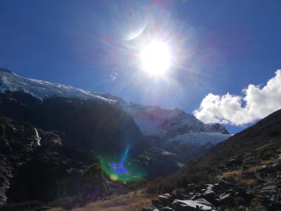 Das Wasser ist von einem durchsichtigen Blau und schlängelt sich mal wild, mal geruhsam an grauen Steinen ins Tal. Als wir oben ankommen, setzen wir uns auf einen großen Stein und genießen die Sonne und ein kleines Picknick. Heute ist die Sonne wirklich noch einmal zur alten Stärke zurückgekehrt und wir werden bestimmt braun. Der Gletscher glänzt im Sonnenschein und das ganze Tal scheint zu strahlen.