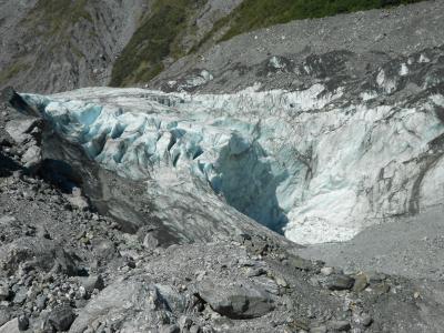 Dann halten wir am Fox Glacier, den haben wir bei unserer damaligen Tour an der West Coast letztes Jahr ausgelassen. Der Weg durch das Tal ist wunderschön, wir passieren einige Wasserfälle und Bäche und alles ist wie immer von der Sonne beschienen. Wir stehen nicht einmal 200 Meter entfernt vom Gletscher und es ist schon imposant, aber auch irgendwie dreckig.