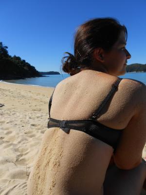 Abgesehen von einigen Wanderern teilen wir die Bucht nur noch mit einigen Möwen. Wir legen uns in den weichen, warmen Sand und genießen das Nichtstun. Nachdem wir einige Kapitel auf Erich Fromms „ Vom Haben und Sein“ (danke Fabian!) gelesen haben, wir uns dann aber doch zu langweilig und wir fürchten auch einen Sonnenbrand. Wir erheben uns aus dem Sand und müssen erst einmal über unsere total panierten Rücken lachen, dann spielen wir ein wenig mit dem Sand herum und ziehen uns dann wieder etwas über, um uns auf den Rückweg zu machen.