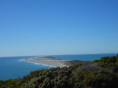Wir stehen früh auf, wie eigentlich immer in letzter Zeit und fahren weiter über Collingwood zum Farewell Spit. Wir nehmen erst die falsche Abfahrt, also fahren wir zum Leuchtturm, um dort zu frühstücken. Der Weg nach oben ist steinig und steil (mit Flip Flops nicht so einfach!) und nach einer halben Stunde kommen wir endlich an, nachdem wir erst einmal über den Leuchtturm lachen müssen, eine winzige Vorrichtung mit Solarantrieb, naja Größe ist bekanntlich nicht alles. Wir drehen uns um und können von hier schon den sichelförmigen Strand des Spits sehen und genießen so Frühstück mit dieser Aussicht.