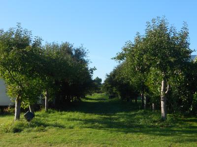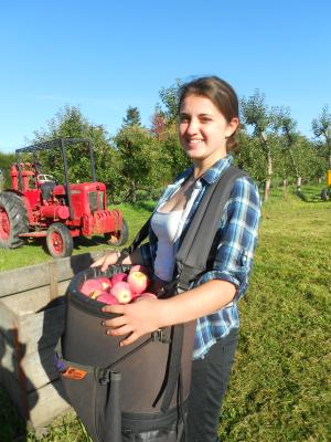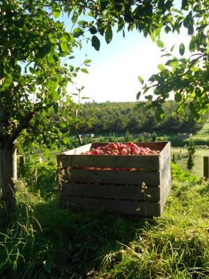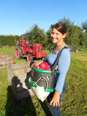 Ein leichter Geruch von Äpfeln liegt in der Luft und das Gras glänzt grün im Sonnenlicht. Hinter uns liegt ein kleiner Fluss und noch mehr Apfelbäume. Mit der immer mehr steigenden Sonne wird es ganz schön heiß in unseren langen Sachen, aber besser warm als zerkratzt! Stetig füllt sich die massive hölzerne Kiste, die bis zu 400 Kilo fast, mit frischen Äpfeln. Eines Tages werden sie zu köstlichem Saft oder sogar zu Cider verarbeitet werden. Mit den anwachsenden Apfelbergen wachsen auch die Schmerzen in den Schultern und Beinen, aber wir sind noch guter Dinge. Als der höchste Sonnenstand erreicht ist, muss allerdings eine Pause her und wir schauen uns zufrieden das Resultat unseres Vormittags an. Da wir keine Gummistiefel haben, werden unsere Füße allerdings in unseren Laufschuhen immer relativ nass und sind nach einem Achtstundentag nicht gerade sehr ansehnlich!